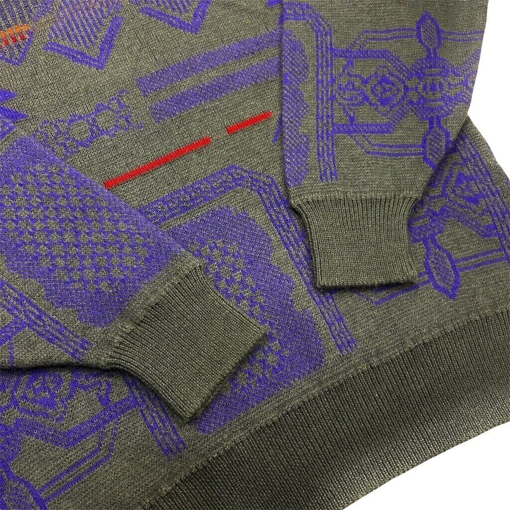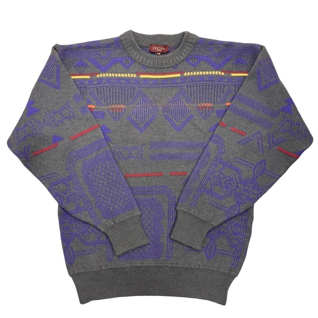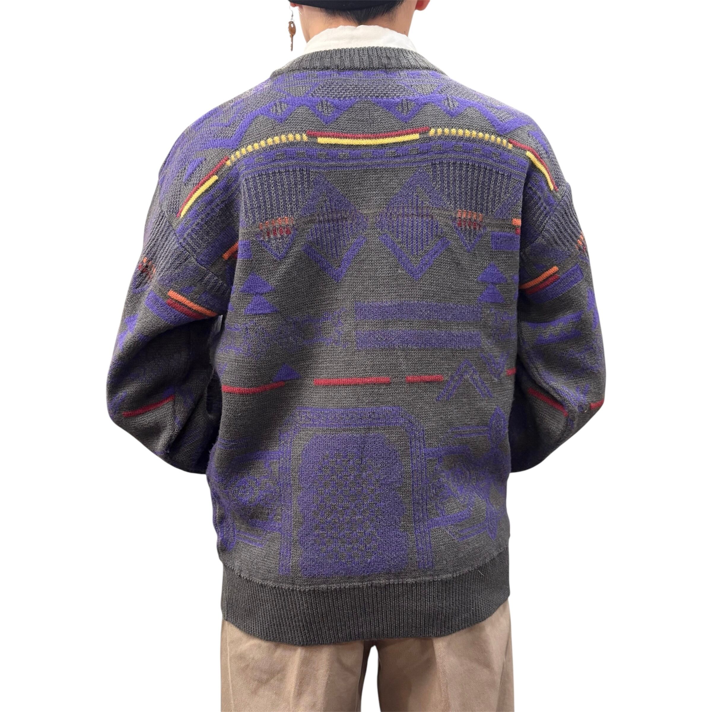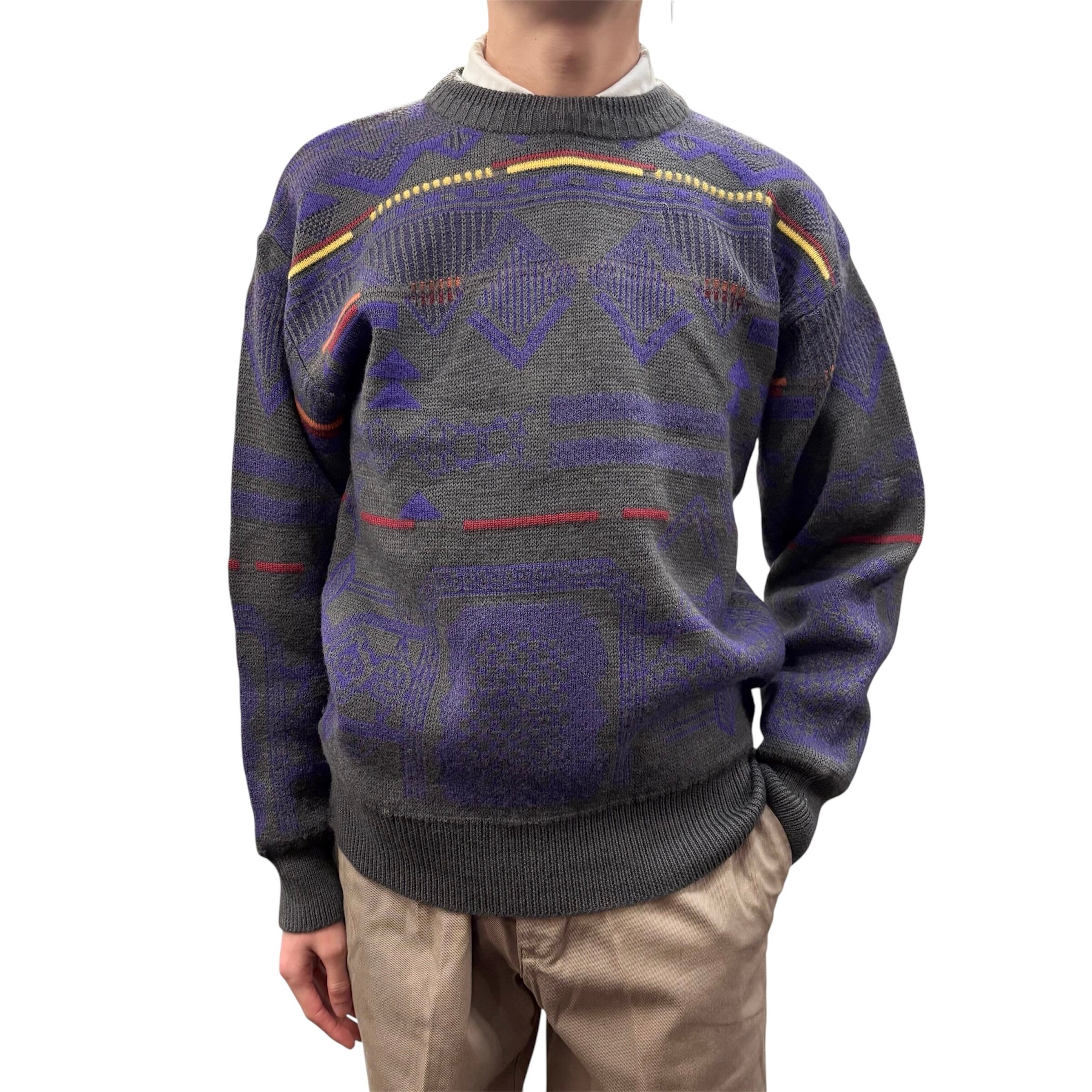 グレーをベースに様々な幾何学模様がデザインされたニットです