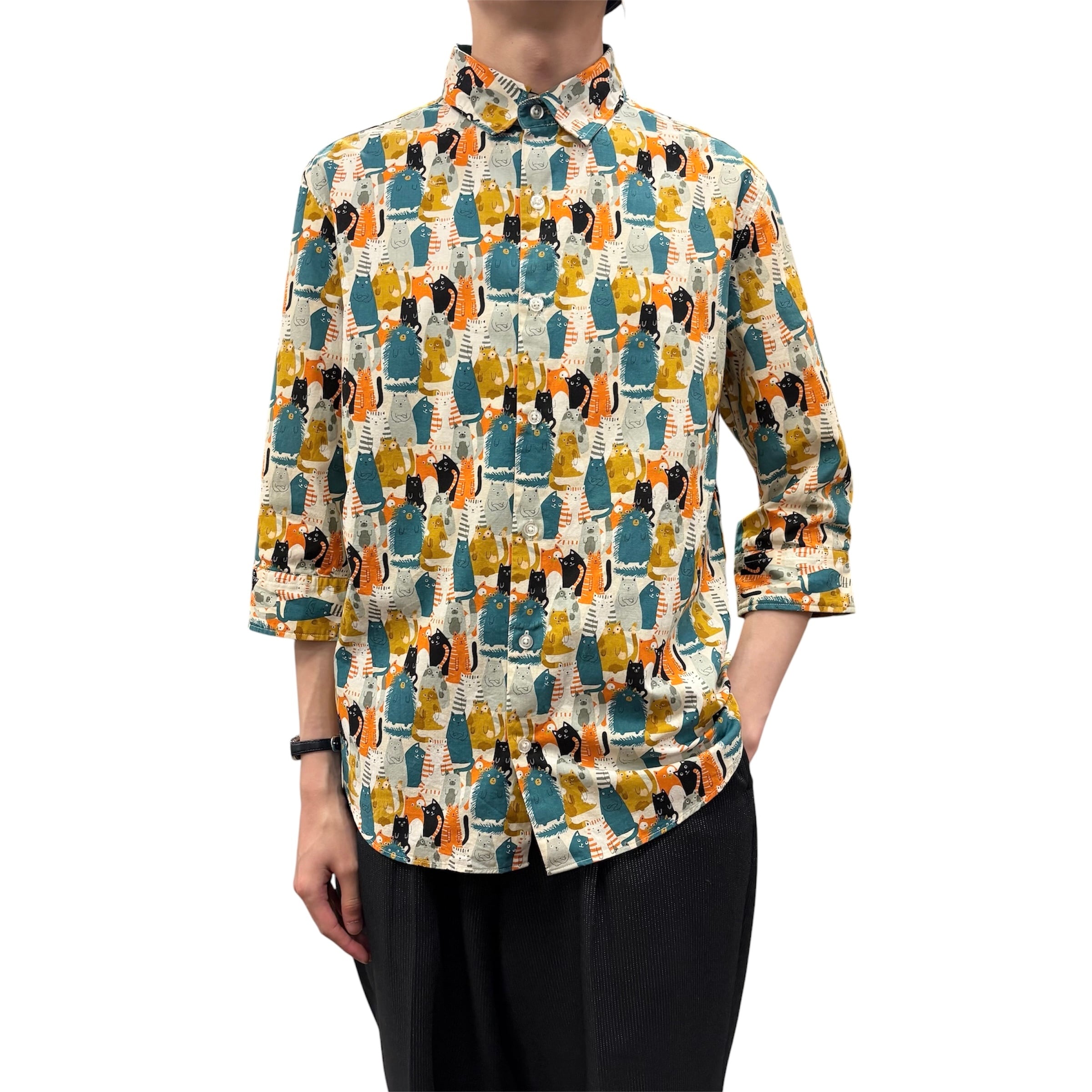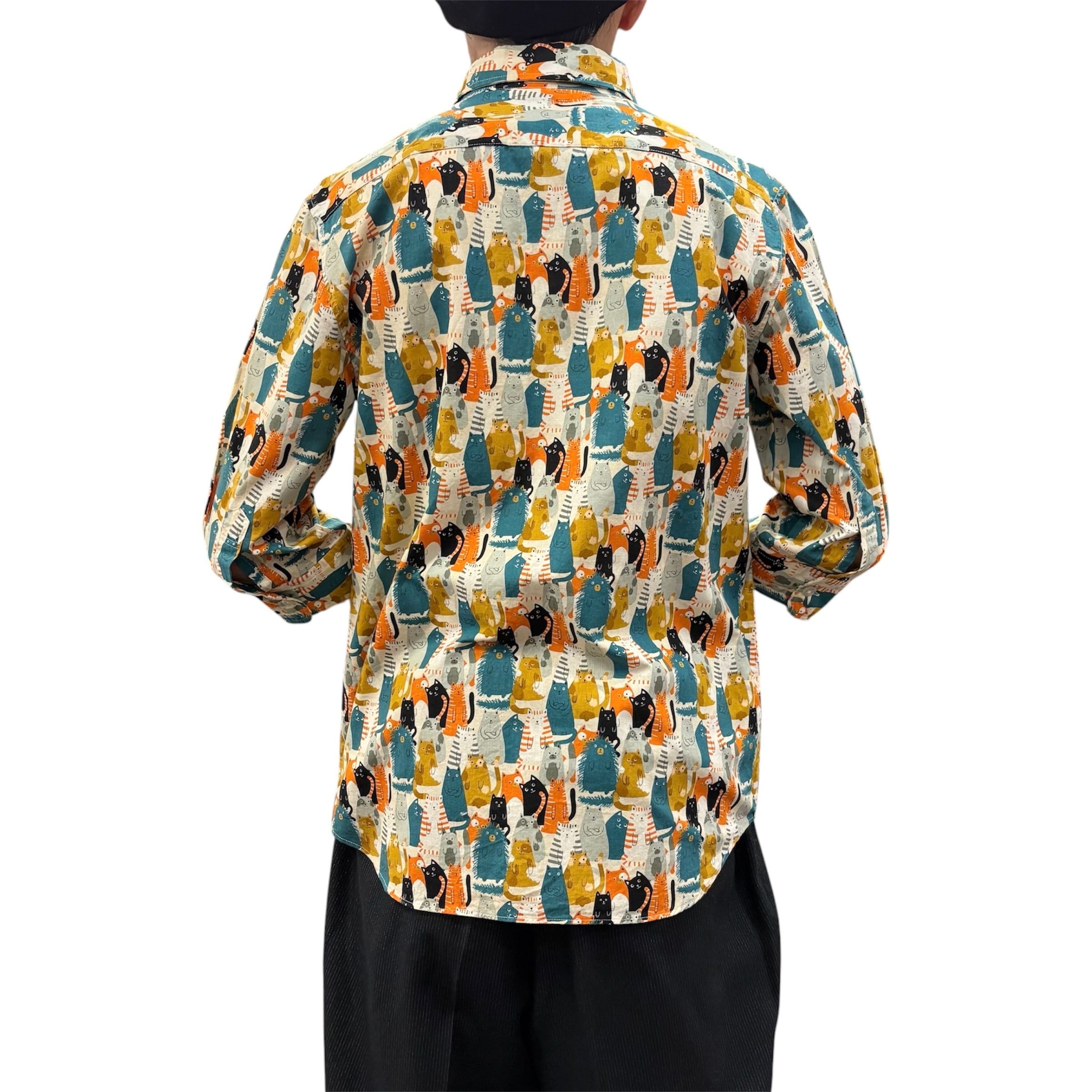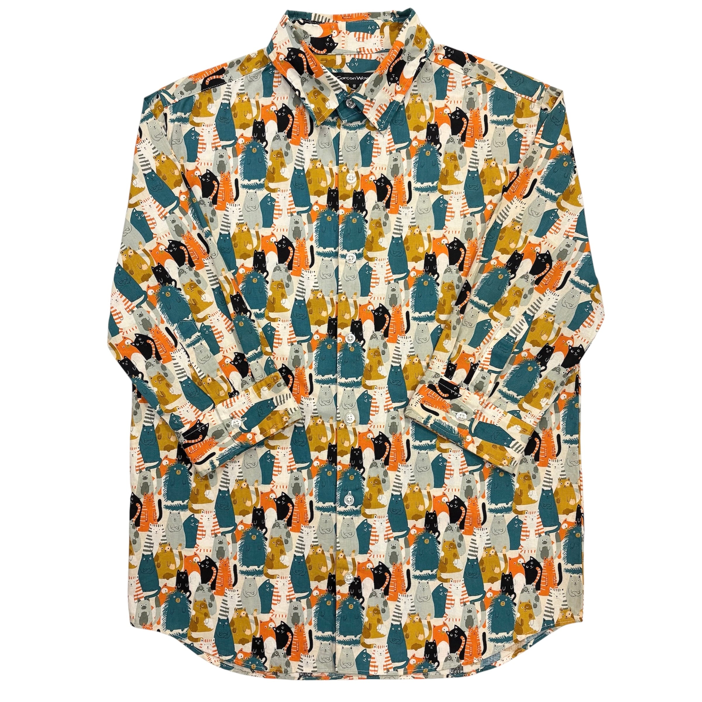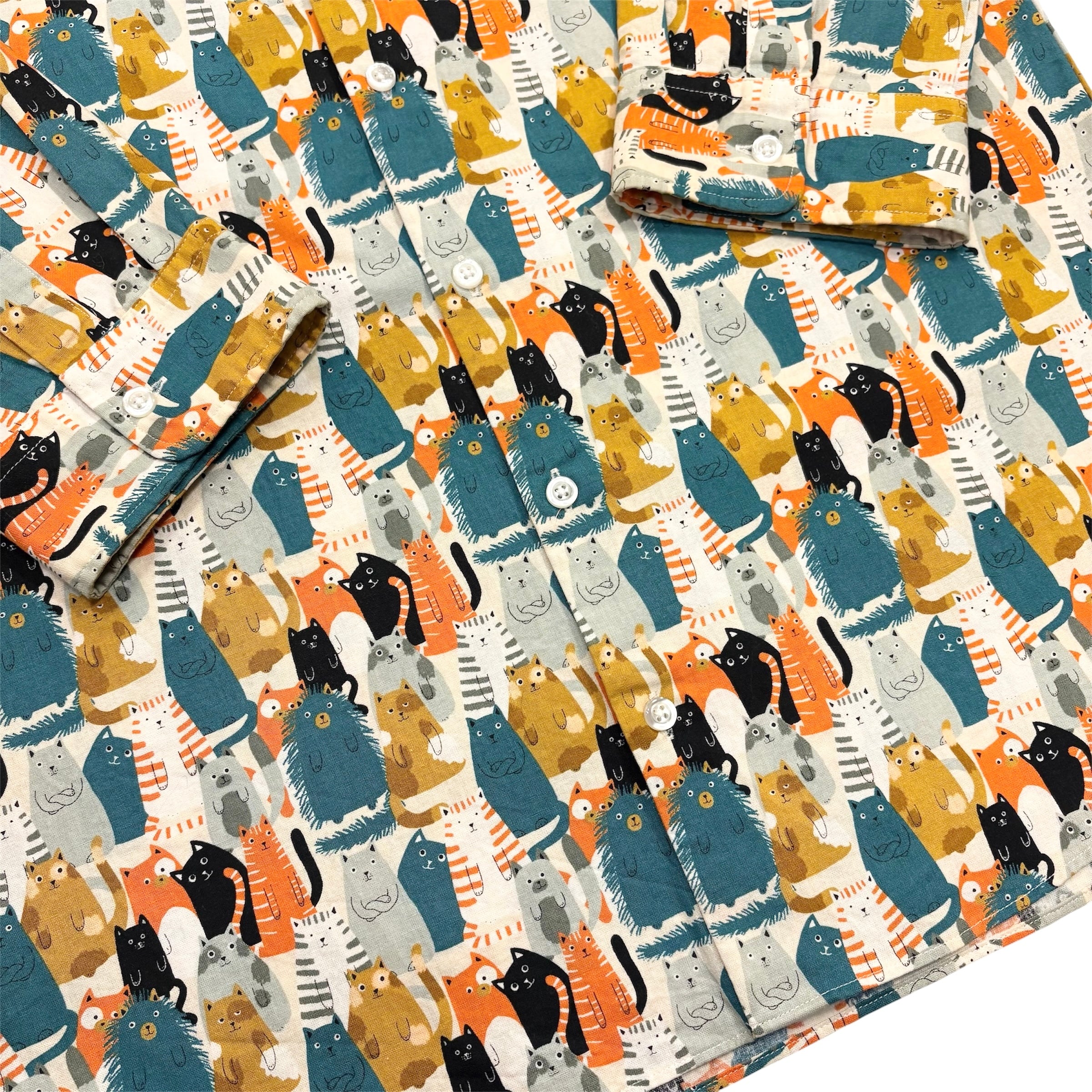 多彩なポーズをとる愛らしい猫たちが、テキスタイル全体を埋め尽くすように描かれた、遊び心あふれるキャッチーな一着です。